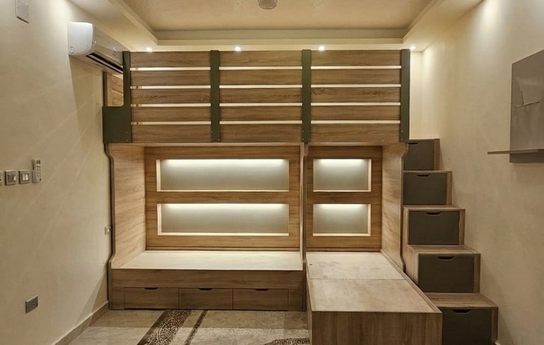 بنصمم وبنفذ مساحتك الخاصة لتكون ملاذ للراحة والهدوء. مش بس خشب، إحنا بنبني واقع فندقي ببيتك بلمسات إبداعية بتعيش العمر